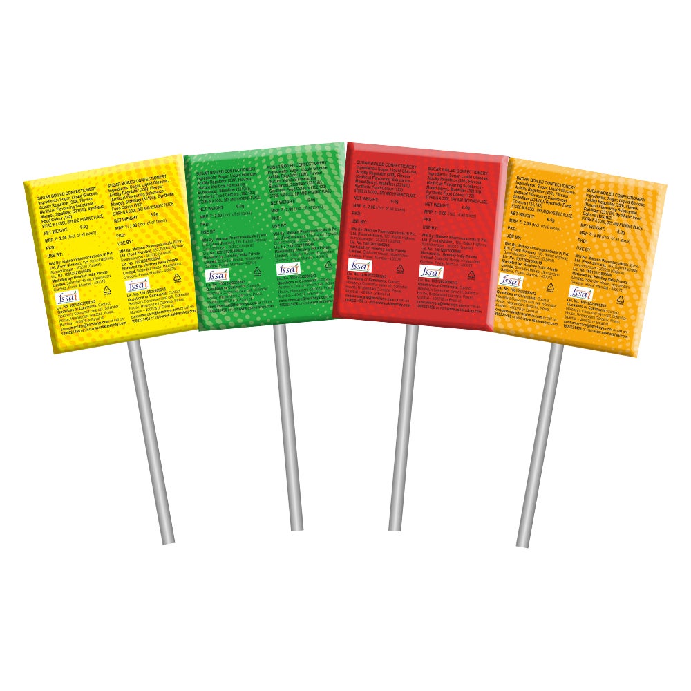 Fruit flavored yummylicious pops. Available in Kaccha Aam, Mango, Orange and Mixed Berry flavors.